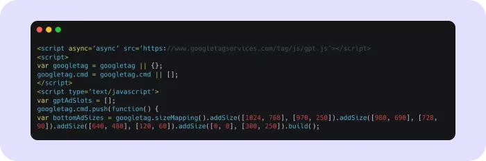 The next step is to integrate Google Publisher Tags (GPT). GPT is a JavaScript tag that defines ad slots on your site and enables responsive behavior by selecting from predefined ad sizes.